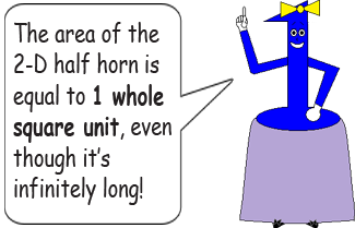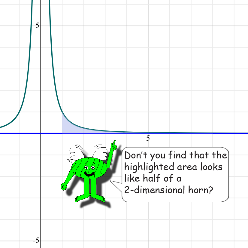 You may have heard of Gabriel's Horn, which is an imaginary horn of infinite length based on this special function: y = 1/x2. To calculate its volume, simply multiply the integral by pi(π). However, n = ∞ due to this imaginary horn being infinitely long! Its surface area is also infinite! In fact, this horn is too big to fit into the physical universe! Anyway, this Web page is about the 2-dimensional version of this imaginary horn. (Or at least half of it!)