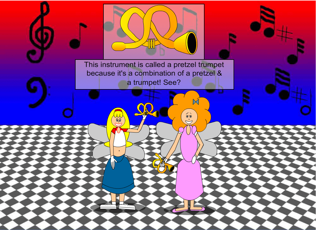 This bonus animation is from the puzzle game entitled: "Musical Logic 2: Music Match-Up" Due to animated GIF's always being silent, I didn't have the 2 fairies blow the trumpets to play music. Instead, Sabrina spins her trumpet around her index finger & Hilary holds her trumpet like a barbell to exercise her arm. Because of how the trumpets are designed, they're also pretzels!