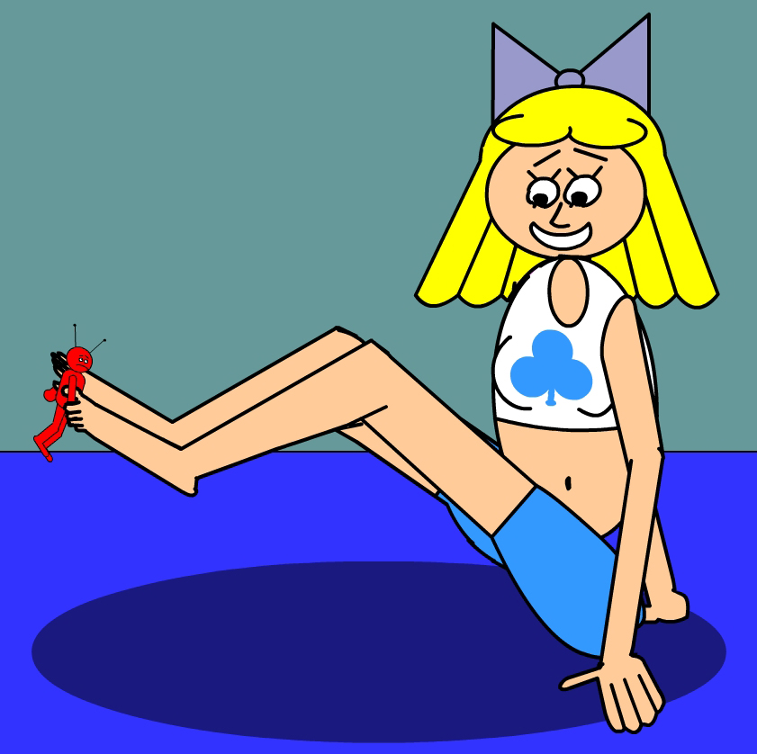 Imagine if you were Archy Ant's size & saw the sole of another person's foot coming down onto you. The body language sends this message: "I'm going to stomp on you!" It's understandable why a small character like him would fear feet, but Goldilocks also proved that feet can be used gently. In scenes of this episode & its sequels, she grabs & caresses Archy with her beautiful, bare feet, trying not to put too much weight on him. Their sizes contrast so much that he is like a toy to her!