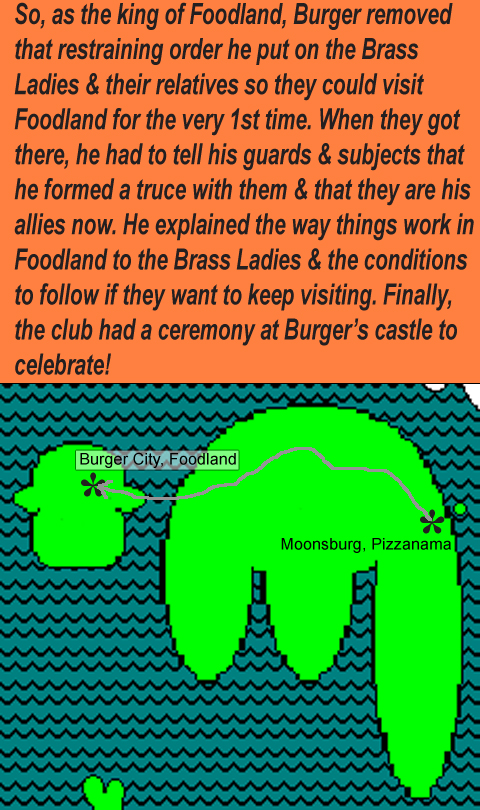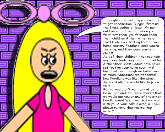 Burger found out from Sally that he forgot to remove that restraining order, which forbade the Brass Ladies & their relatives from visiting Burger's home country Foodland, since their war with the Hamburger Heavy Metallers ended in the Season 5 Finale. Turns out that was the last action he needed to do to receive redemption. Of course Burger didn't want any enemies in his home (who does?) but the Brass Ladies always wanted to visit Foodland for the experience, despite their disputes with the Hamburger Heavy Metallers. Now that the restraining order has been removed, it was worth it to form a truce with Burger & the other Hamburger Heavy Metallers! Now that they're allowed in Foodland, the Brass Ladies practically removed his restraining order from Heaven by giving him redemption!
