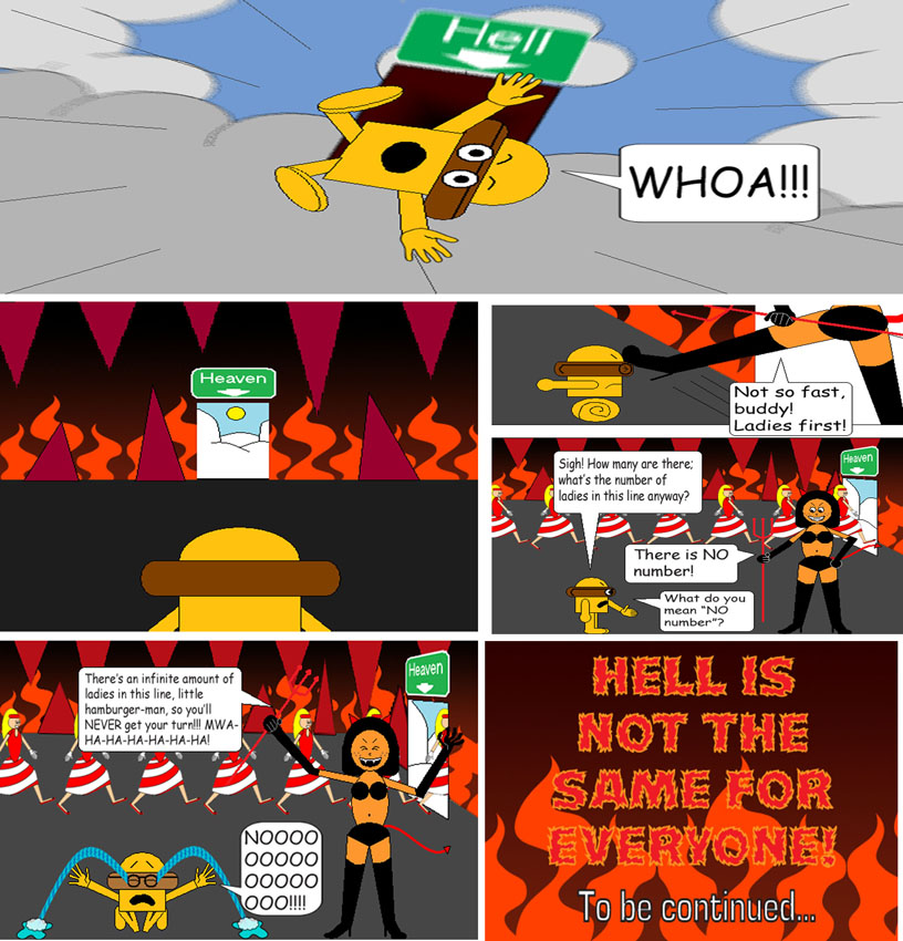 You know what? There's really no such thing as an infinite line of ladies in this world, so I don't think we gentlemen have to worry about that! (Or is there?...Infinity is just part of nature. But finiteness is actually more complicated than infinity!) But seriously, ladies, that's an extremely cruel (but hilarious) way to treat a gentleman! What was going to happen to Burger next before he wakes up from this nightmare is that a bunch of other she-demons were going to appear &...Oh, no, I can't draw that many she-demons, & I don't want to either! The scene would be so violent that this cartoon would have to be rated X!