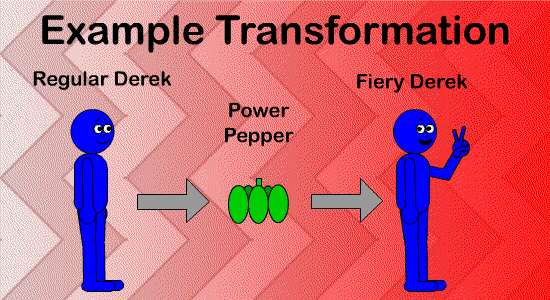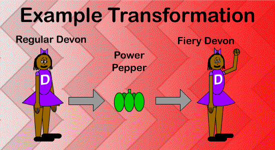 Have you noticed how some of the characters of "Blueworld Adventures" transform after using special items? The characters or their clothes change color during these transformations! For example: Derek C. Jr.'s blue fur glows a bright red color after he eats power peppers; it shows that he's all charged up with fire power!