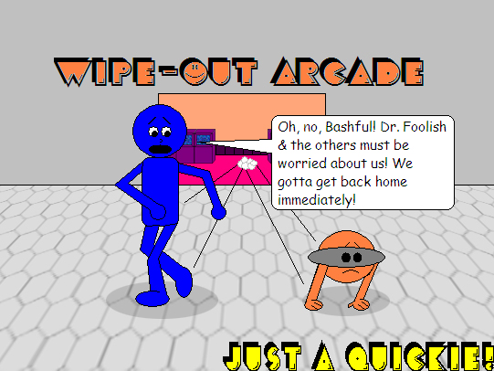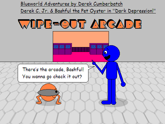 This is the 6th episode of the 1st season of "Blueworld Adventures/Blueworld & Beyond" & the story starts with Derek Cyannus Jr. going into the Wipe-Out Arcade of Crescent Plaza with his pet oyster Bashful. Bashful kind of looks remarkably like Burger Meat Food, since I took another look at the character, except that Bashful is rounder, legless & has blacker eyes. Luckily for Bashful, pets are permitted into the arcade as long as they're tame & Bashful is tame! Also, notice the font of the letters. Don't they remind you of Pac-man?