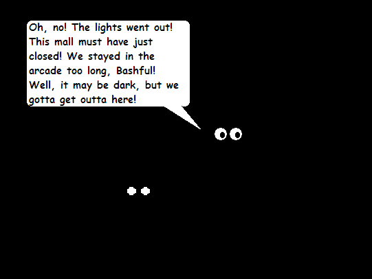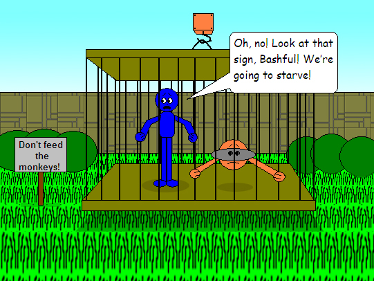 Anyway, the 2 main characters stayed in the arcade so long that they got locked inside overnight! The manager of the arcade didn't see them before he took off the lights. Oh no! Derek & Bashful were in complete darkness so they couldn't see where they were going. They both bumped their heads into a wall so hard that it knocked them out! They had the exact same nightmare where they were locked into a zoo cage! After some mean, unseen, imaginary people laughed at them, the 2 noticed a sign saying: "Don't feed the monkeys". How awful! There was nothing for them to eat in the darkness in the closed arcade at the mall. It's a miracle that the 2 didn't starve to death while they were locked into the arcade overnight & asleep. However, their nightmare reminded them of their hunger!