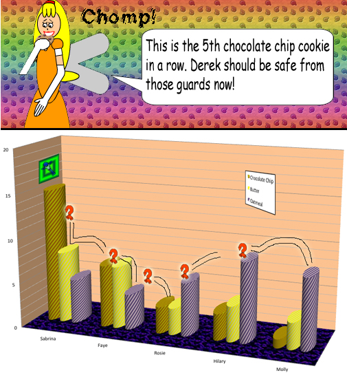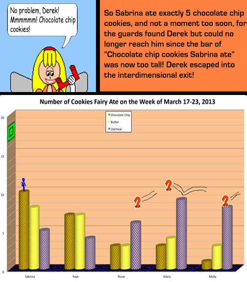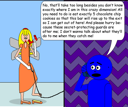 Anyway, this episode is most likely my #1 favorite episode of my cartoon series! I thought about making several more episodes featuring the Graph Dimension but I decided to cut the 10th Season short & conclude the cartoon series so that I will have more time for other important things. Making hundreds of episodes is too much work for just 1 person! At least the Graph Dimension made a 2nd appearance in another Season 10 episode: "Dottie Doll's Desire". What happens in that dimension depends on what the characters do in their home dimension. In the example below, (And of the episode) Sabrina Pixie had to eat 5 chocolate chip cookies so her friend Derek could reach the interdimensional portal, escape the secretoids & get back to his home dimension safely. He also had to avoid the poisonous dark matter on the chamber's floor. This graph chamber shows how many cookies the 5 Fantastical Fairies ate that week. At the beginning of the scene, Sabrina ate 10 chocolate chip cookies before she helped Derek escape, according to the graph bar. But after eating 5 more cookies, the bar rose up to 15 so Derek could reach the portal & escape the secretoids!