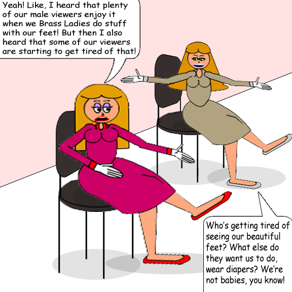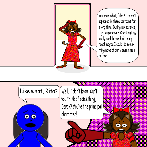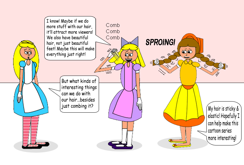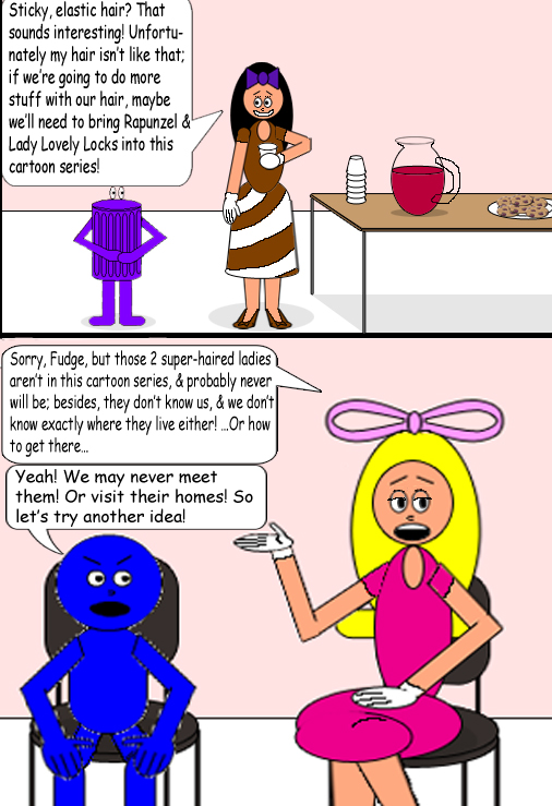 All of the characters in the first scene tried to think up good ideas about what they could do to make these cartoons more interesting; they thought these cartoons might get boring since they helped decrease the crime wave of their home planet Photonis. Without criminal butt to kick, they would need to find something else to do that's interesting. I bet you noticed that the Brass Ladies use their feet a lot, but Goldilocks, Alice Liddell & Patience Muffet suggested that they could use their hair to make things more interesting! Fudge Stripes then got the idea to invite Rapunzel & Lady LovelyLocks into this cartoon series; however, due to copyright & trademark issues, I can't put Lady LovelyLocks into this cartoon series; Mattel™ owns her, so I would need their permission first. I was going to have Derek Cyannus Jr. & Sally B. Martin mention this in the cartoon but I decided that the copyright/trademark stuff is my problem, not my characters' problem; so their excuse is that they don't know where these other characters live or how to get there! Also, they may never even meet these characters. On the other hand, Rapunzel is practically in the public domain now since she is a classic fairy tale character although I don't plan on featuring her in my cartoons. Perhaps another character of mine can play as Rapunzel...