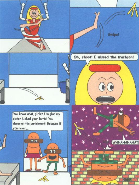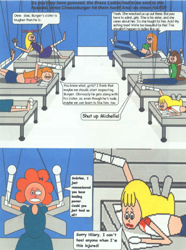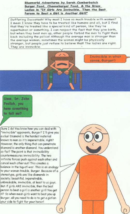 The full title of this comic strip episode is: "If Girls Are Invincible, Then the Best Person To Beat A Girl Is Another Girl!" The story starts with Burger moping about the fact that he had female enemies that physically hurt him, but he can't hit them back without getting into trouble because of how society usually fells about men hitting women. "Maybe ladies are invincible!" he thinks. Dr. John Von Foolish says to Burger that invincibility countermeasures invincibility, which gives him an idea! He summons his big sister Cheeseburger Milky Food into the club to fight for him! And of course, Cheeseburger beats the Brass Ladies up! The Brass Ladies learned to have a grudging respect for Burger since he & his sister love each other. (They're siblings, after all!) At the ending, when Burger & Cheeseburger come to taunt them in the hospital, Burger slips over Candy's banana peel, and then she was glad she missed the trashcan! As the narrator, I figured the injured ladies took enough punishment. Because of the culture he comes from, Burger is not very good at being a gentleman; also, his species is considered subhuman.