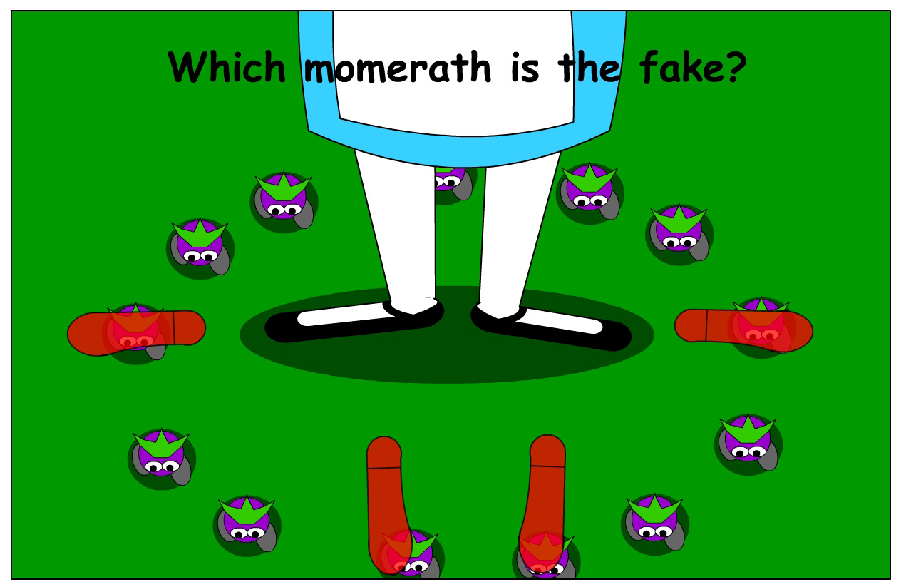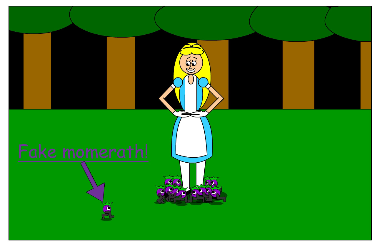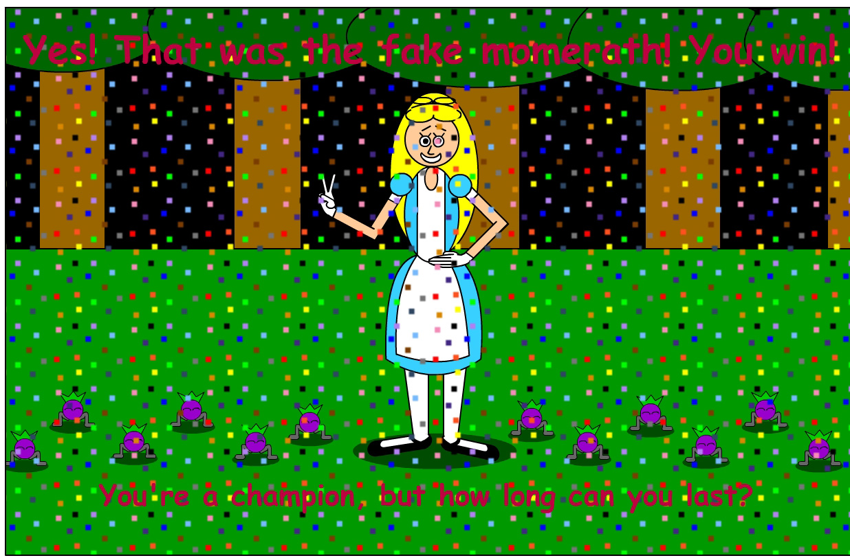 After winning in the hard level, the game repeats the hard level forevermore until you finally lose. However, if you get tired of playing, you can also select "Rewind" in your mouse's pop-up menu to reset the game! Unfortunately, you don't get to see which creature was the fake momerath after Alice stomps on the wrong creature. I know that sucks, but it would have been even more time-consuming to program the games so that the right creature blinks after you lose. On the upside, these 2 games teach you why you should pay attention. Also, if you play these 2 games in the Elmedia Video Player, you can cheat even more! You can click the player's Play/Pause button on the screen to freeze or unfreeze the momeraths. You can even use your mouse to move the cursor dot to rewind or fast-forward faster! Or of course, you can simply reset the game! Seriously though, an old proverb says that cheaters never really win or prosper. But on the other hand, if your adversaries fight dirty, then you got to fight dirty, too, to survive!