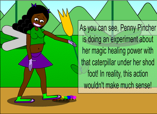 The original mini-animation begins with Penny Pincher picking a yellow tulip & smelling its fragrance. She was taking a break from her job of selling useful things in space. (She's self-employed by the way!) She took her break on the planet Photonis, which is the main world of Blueworld Adventures/Blueworld & Beyond; the scene takes place somewhere between Moonsburg & Dollar City, 2 cities of Pizzanama. After taking 16 steps, she accidentally steps on the cute rainbow caterpillar! Fortunately, she has great magic healing power! This brown-skinned, black-haired fairy can heal others magically by hugging them, kissing them, or even caressing them with her hands or feet! Shoes can't prevent her from healing a cute caterpillar with her feet! She heals the tiny insect using the same foot she crushed it with by accident. Even though her pretty ballet flat shoes are quite hard, she delicately pets the soft insect with 3 gentle foot taps from her shod left foot. Then she hops over it so she doesn't crush it again & goes on her way.