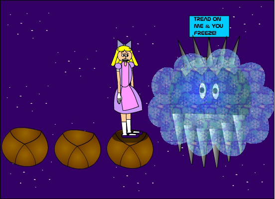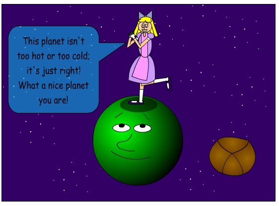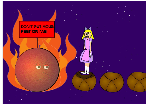 Anyway, after the scrolling text scrolls completely out of view, the story starts with Goldilocks skipping on a path of space rocks. (Should I call them asteroids or meteorites? Maybe they're both; both of them are technically space rocks!) She's a space giantess that's looking for a planet to stand on in her wacky dream. The 1st personified planet(the red one) was too hot for Goldilocks to stand on; his sign reads: "Don't put your feet on me!" Of course, Goldilocks didn't want to get burned, so she runs away & finds another planet to stand on that's blue in color. However, he didn't want to be trod on either; his sign reads: "Tread on me & you freeze!" The spikes on his surface could stick Goldilocks' feet, too, as well as frostbite them, so she runs away! Finally, the 3rd one she finds, which is green in color, was sleeping peacefully. As she jumps on top of him, he wakes up & smiles; he didn't mind that Goldilocks' feet were touching him! In fact, he enjoyed it when she petted him with her feet! Notice how she pops her left foot in pleasure in the next image. The right foot was the one that she tapped while standing on the green personified planet; she rubbed his surface, which she was standing on, with that same foot, too! Cute-looking, isn't it? Looking for another planet that supports life would be just like Goldilocks' wacky dream!