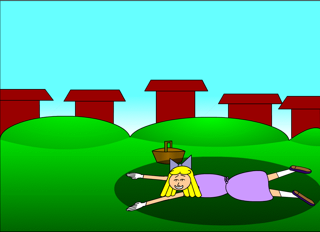 In a way, foot-tapping on the ground is equal to petting the planet with your foot!(or feet, if you tap both of yours) If your home planet could shrink so that you could see its round shape completely, then you could see exactly what I just typed about. I tried to animate Goldilocks hugging the green personified planet in her dream, too, but it was a bit too difficult to animate; besides, 1 of her arms & 1 of her legs would have to go behind the green planet to make the animated image look right. So to simplify things, I decided to use a transition to show her lying on the ground in a dreamy way. As her cousin Alice Pleasance Liddell comes into the picture, she wakes her up & asks her what is she doing; Goldilocks responds: "I'm hugging the planet!" which was technically true, because lying on the ground romantically equals hugging the planet, in reference to the 1st sentence of this paragraph! (...Which is a statement about size astronomically!)