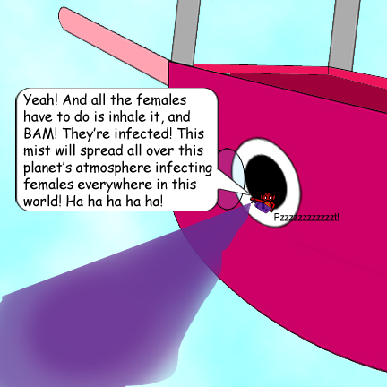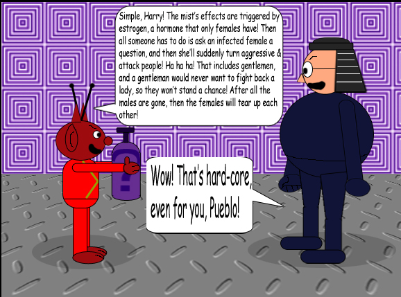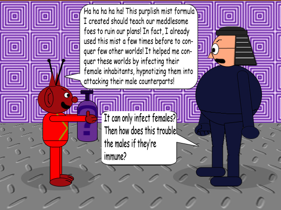 In the 1st chronicle of Blueworld Adventures, Harry Fool was the main villain; but in the 2nd chronicle: Blueworld & Beyond, Pueblo the Destructive Alien became the main villain. This episode proved how much of a threat he is! The chaos he caused between the 2 sexes with his wicked mist of Question Hate Syndrome, and it only infects females! As aggressive as this stuff makes the female characters, it was certainly bad for the male characters, too! I'll let you decide which sex that it's worse for: the males or the females.