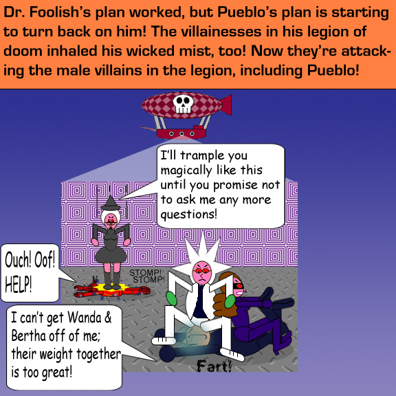The most important part of the story is when Pueblo's female members of his legion of doom turn against him & his ally Harry Fool, who wore a Darth Vader helmet in this episode! He forgot that the villainesses joined his legion; since they were female, the stuff infected them, too! That right there tells you why you shouldn't be chauvinistic. Chauvinism is a type of sexism against females; its opposite is feminism, which is sexism against males. All sexism is bad, so please remember that! Sexists can be very exclusionary with their opposite sexes, or even worse, spiteful.