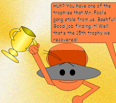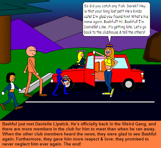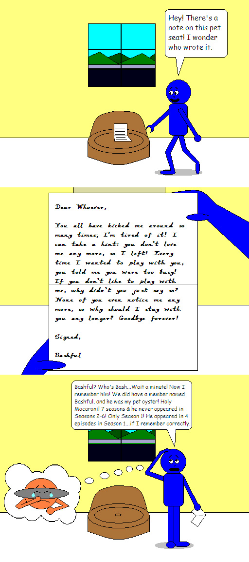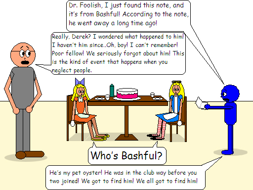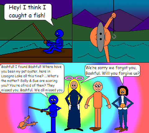 Dr. Foolish started blaming himself for Bashful's disappearance, when fortunately, Derek suddenly found Bashful grabbing the hook and climbing the string of his fishing stick! It just so happens that Bashful decided to move to Lasagna Lake, Pizzanama! That's where he was living all this time! After all those years, Derek finally finds & reunites with his pet oyster; it was a good thing he & the others decided to go fishing at Lasagna Lake, otherwise they never would have found their forgotten member. Furthermore, Bashful found something himself! He found one of the trophies that Harry Fool & the other Blueworld Villains stole from the Weird Gang! (Since this is a Season 7 episode, the story takes place during the Trophy Trek Saga, which concluded the 1st chronicle of the cartoon series) Danielle Lipstick thought Bashful was cute, yet he almost resembles Burger, and Danielle used to be one of Burger's enemies! Quite ironic, isn't it? Anyway, this is the happy way the story ended.