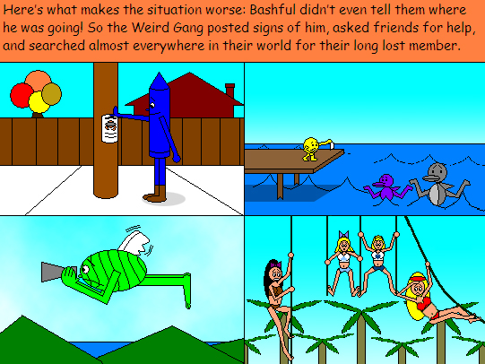 The Extraordinares felt bad about how they forgot their long lost member. To the right of this paragraph, you can see the part of the story when they search for Bashful. According to the text in the orange rectangle, they searched all over their entire home planet! Crayonman AKA Carlton Yoshi Marker(Yep, that's his middle name!) sticks a sign with a picture of Bashful the Pet Oyster. Don Demonvark uses a sign to ask Nick the Dolphin & Christopher the Killer Whale for help. Brain is flying in the air somewhere over Spagetopia for Bashful. Fudge, Goldilocks, Alice L., & Candy Stripes hang around in a jungle somewhere in South Sanka as they search for Bashful. Notice how they use their toes to grip the vines! Despite their efforts, the Extraordinares did not find Bashful in this long, hapless journey around their planet...