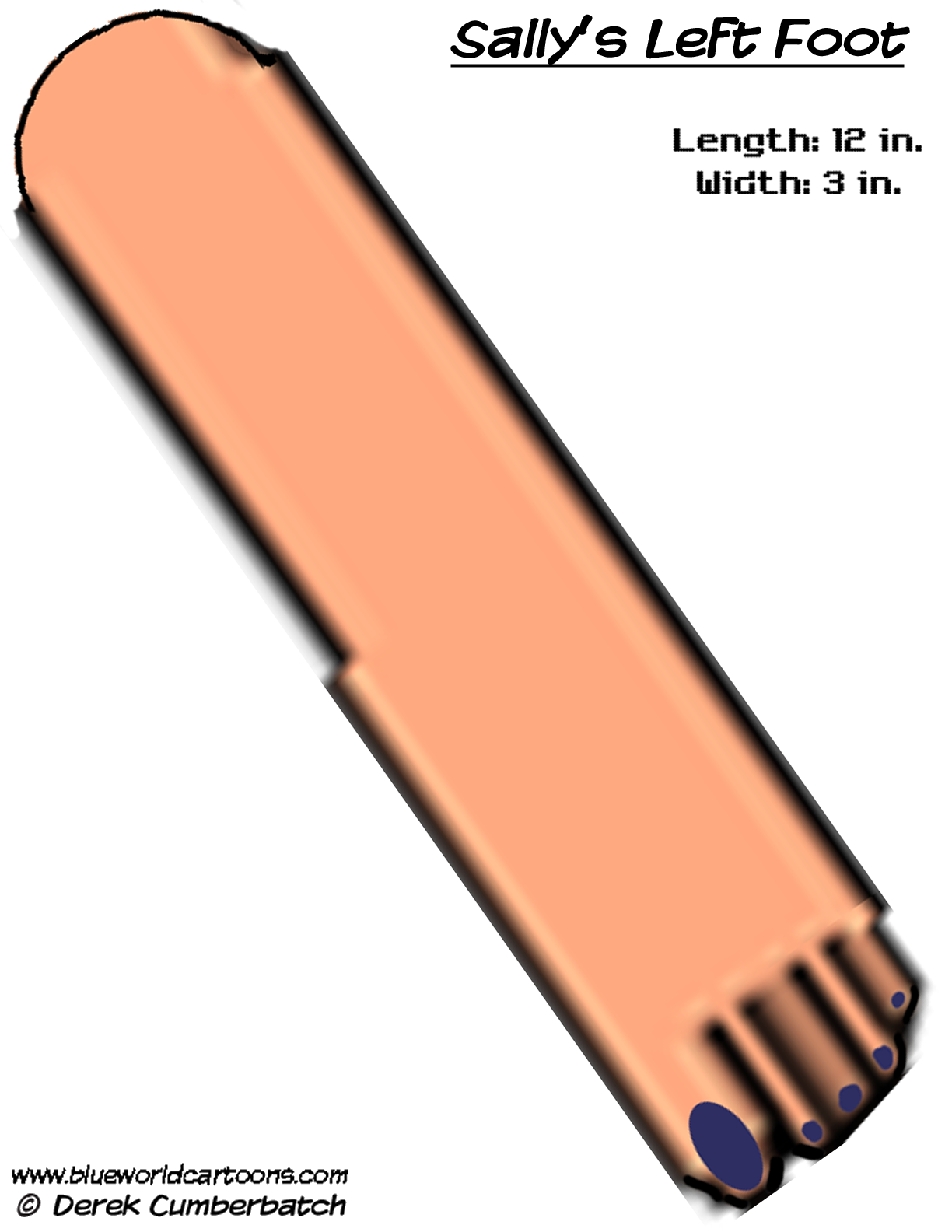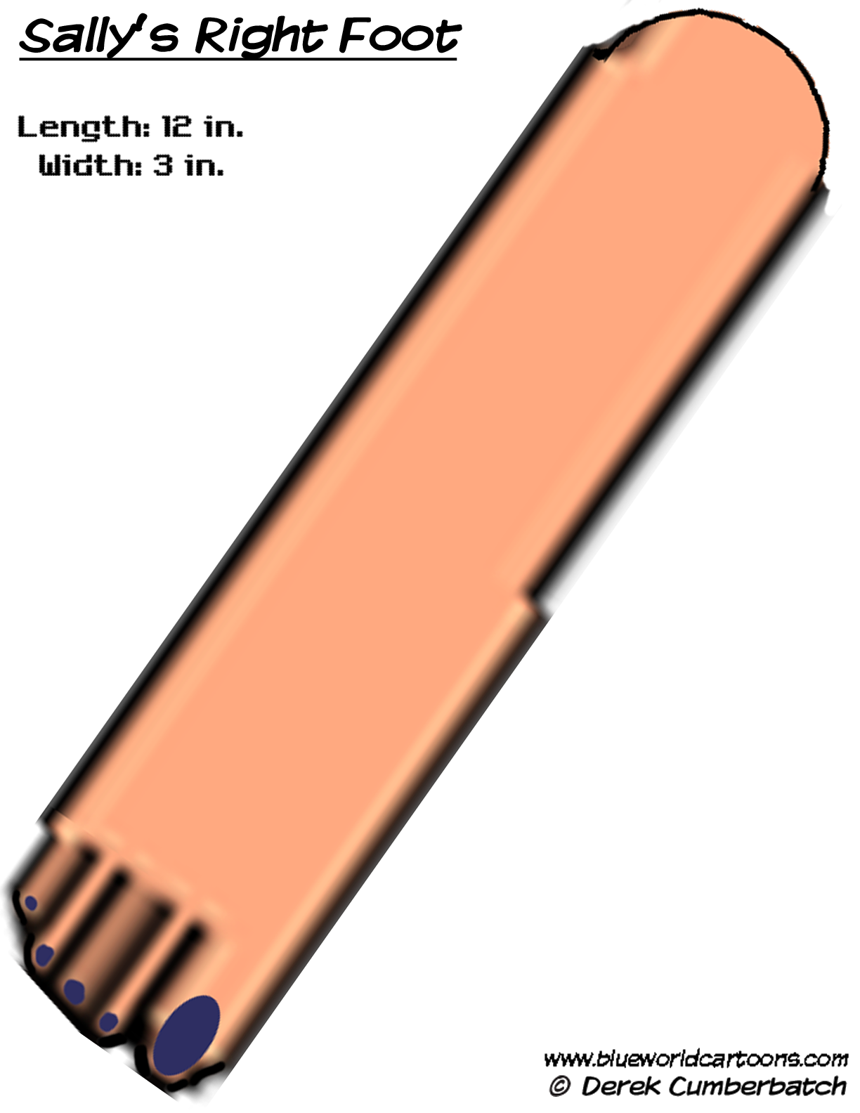 Below are 2D paper cutouts of Sally's bare feet. They are drawn at actual size & tilted to fit into a letter-sized sheet of paper, which is 8.5 inches by 11 inches. That's a total area of 93.5 square inches! Click on either one so you can print it out!