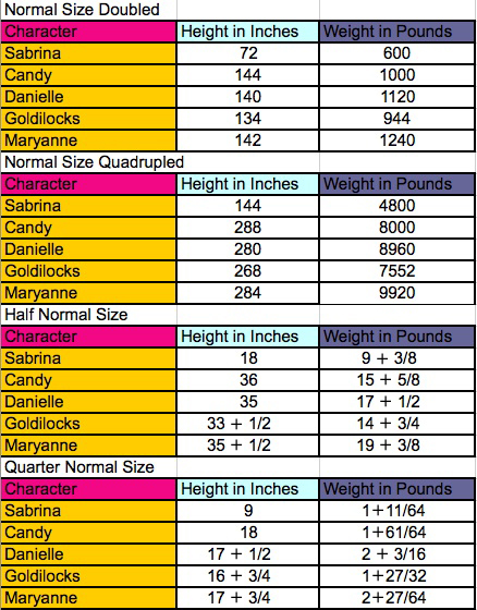 Since the characters are 3-dimensional, you raise the size multiplier to the power of 3.(You can only see 2 dimensions of the characters since images are 2-dimensional.)Afterwards, you multiply their normal sizes by that number, which gives you the solutions shown. Remember what you learned in Algebra? Exponentation is done before multiplication.