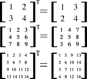 When you transpose square matrices, the numbers in the cells swap places in respect to the diagonal from the top left cell to the bottom right cell!